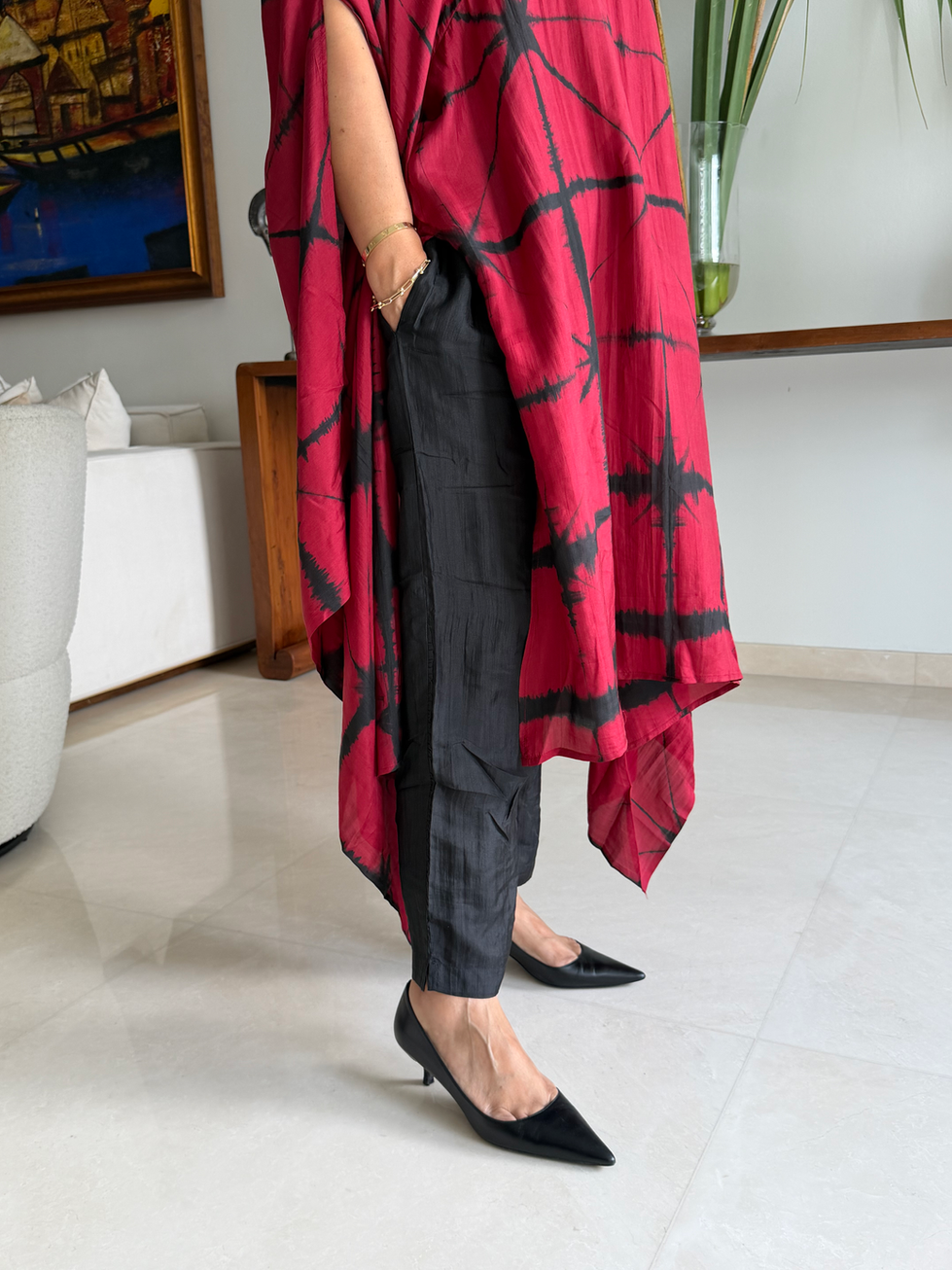 A sleek, slim-fit pant with side slits and delicate frill detailing along the hem, adding subtle feminine charm. Fully elasticated for comfort and designed with functional side pockets, it blends effortless wearability with a modern, refined silhouette.