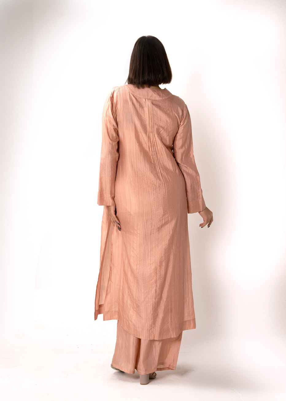An effortlessly elegant silk tunic set designed with graceful movement and refined detail. The kurta features a flattering front slit and beautiful flow, enhanced with contrast multi-stitch accents that add depth and a rich, artisanal finish. Paired with fluid, flowy pants featuring practical pockets and coordinating multi-stitch detailing at the top, this set blends sophistication with comfort for an elevated yet easy look.